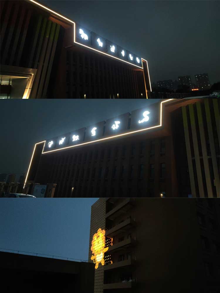 簡介—— 西安市兒童福利院亮化工程,主要是采用線條燈對(duì)樓體的頂部和側(cè)面輪廓進(jìn)行勾勒,主樓安裝十二生肖發(fā)光造型,側(cè)墻采用圖案燈進(jìn)行動(dòng)畫投影,打出絢麗多彩的動(dòng)畫卡通人物,與建筑的實(shí)用完整結(jié)合。
